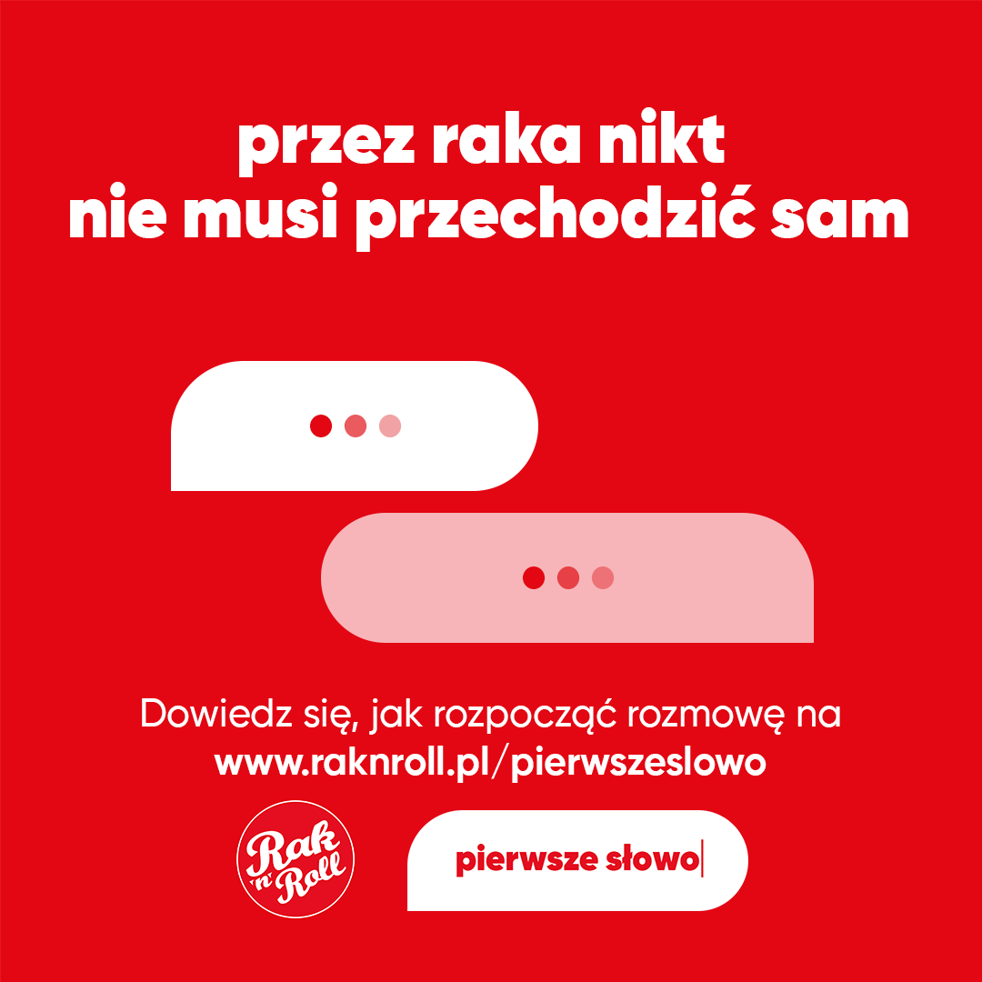 Zależy Ci na osobie, która choruje na raka, wiesz, że Ciebie potrzebuje, ale zupełnie nie wiesz, jak rozpocząć rozmowę. Wejdź na stronę: www.raknroll.pl/pierwszeslowo i zadaj to pytanie w narzędziu stworzonym przez Fundację. Otrzymasz kilka podpowiedzi, jak zacząć i jak wypowiedzieć to pierwsze słowo - a później pójdzie już z górki. Znacie się przecież tyle lat, wystarczy zrobić ten pierwszy krok.